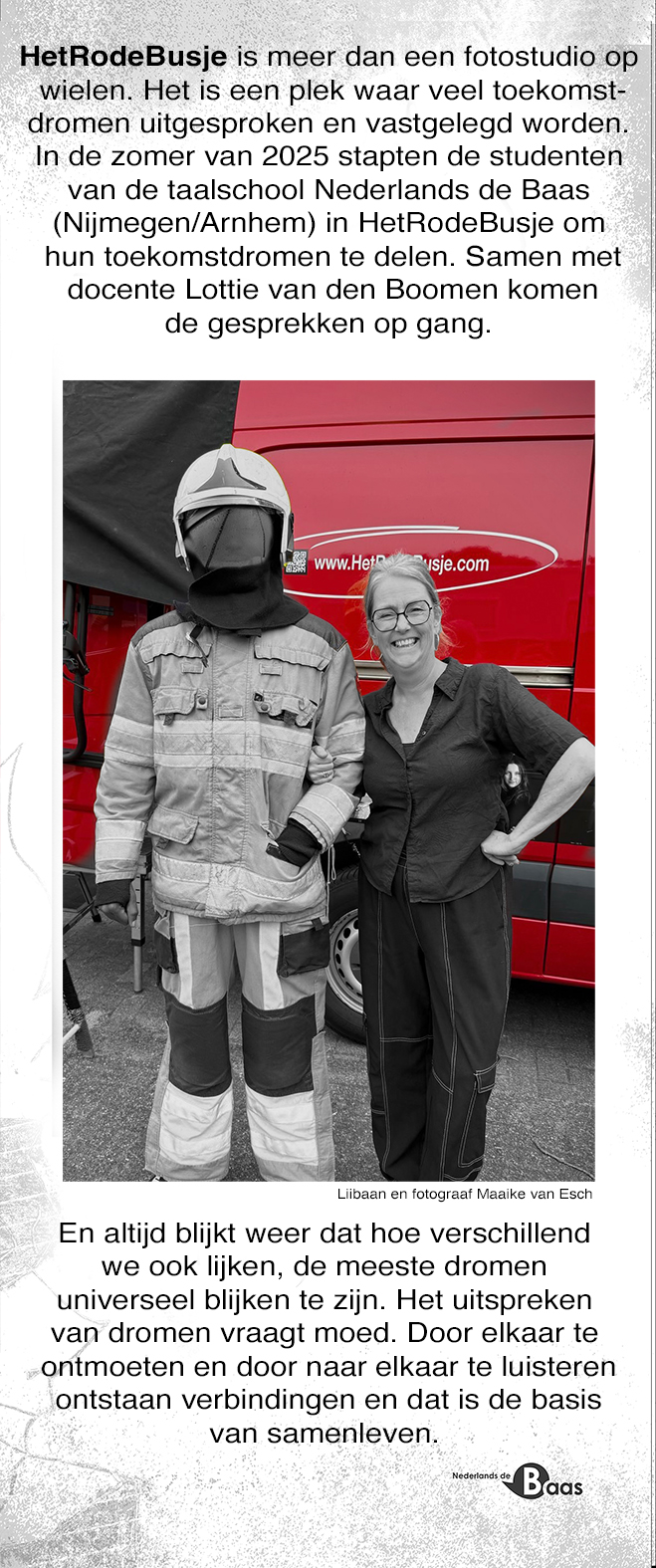 HetRodeBusje is een unieke kunstinterventie die draait om de kracht van menselijke ontmoetingen en creatieve expressie. Maaike van Esch, fotograaf en eigenaresse van HetRodeBusje werkt samen met kunstenaars uit verschillende disciplines en biedt verschillende kunstinterventies aan.